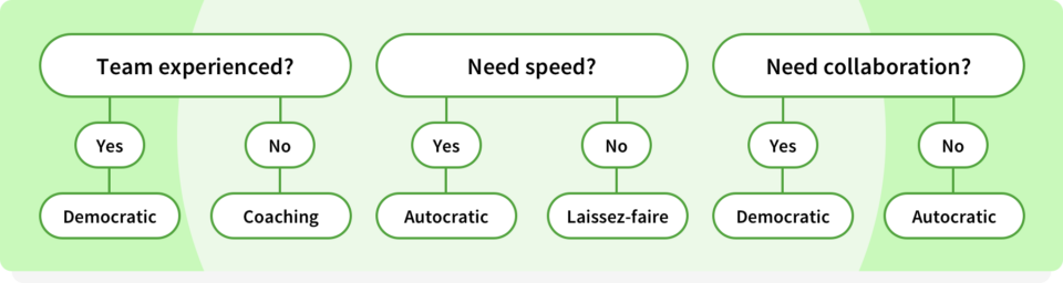 Choosing the right management style depends on the tasks you need completed and the experience level of the team you have on hand. Here’s a quick breakdown of when to use these styles, as well as a quick comparison chart to help you see which style is best for what your team is working on.